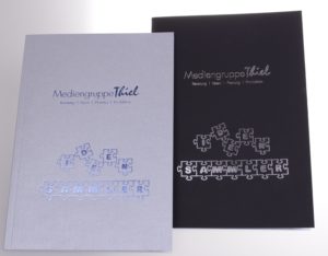 Auf dem kartonierten Umschlag kann das Firmenlogo, sowie ein Titel untergebracht werden, wobei wir in unserem Fall auf die effektreiche Heißfolienprägung zurückgegriffen haben. Hierdurch erhält das Produkt einen edlen metallischen Schimmer und hinterlässt dank dem Druck einen guten EINDRUCK.
