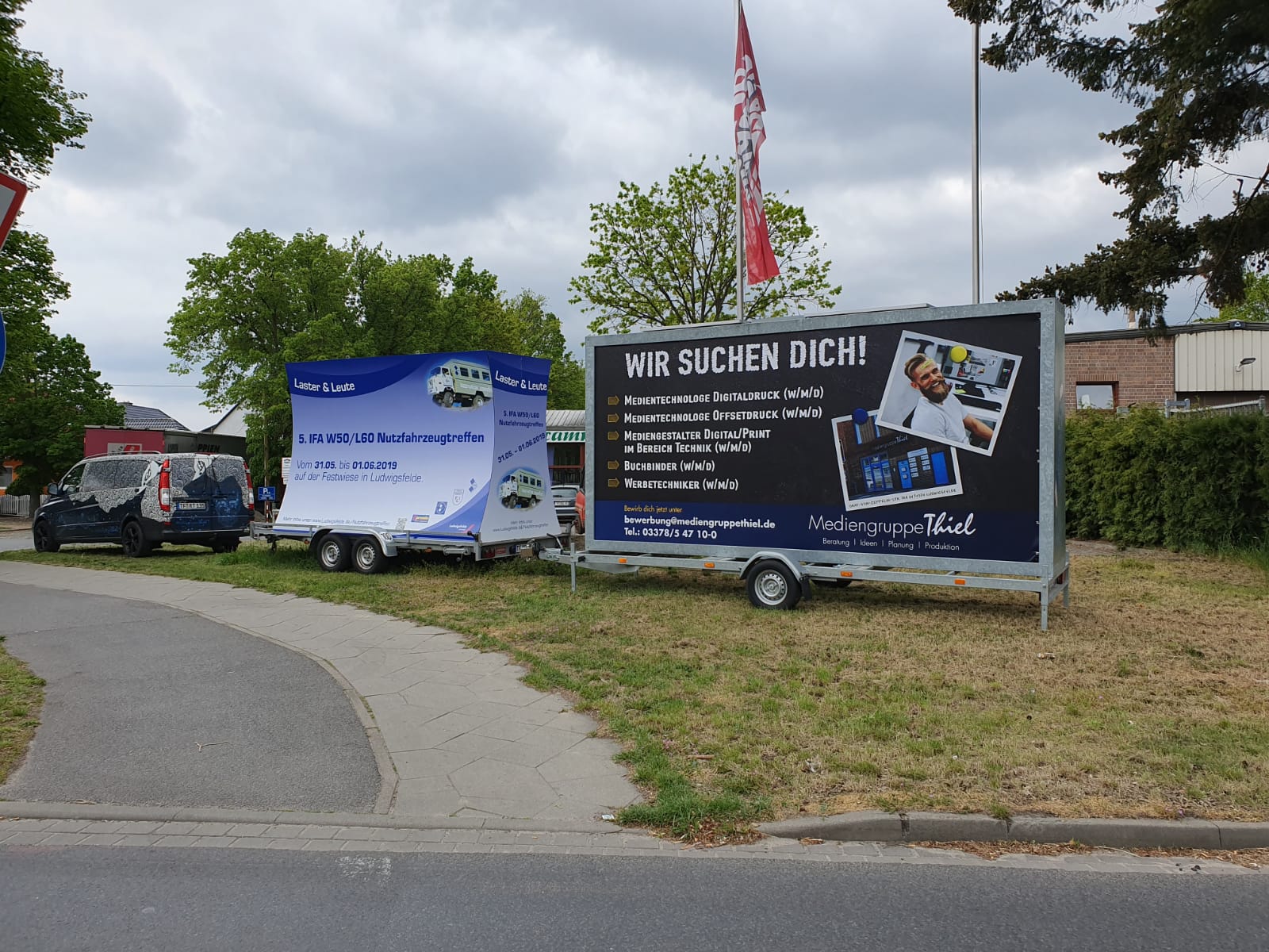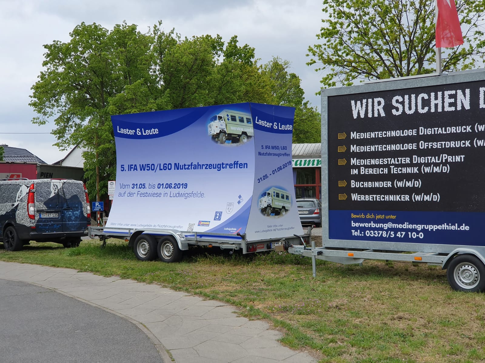 Unsere Werbeanhänger, welche momentan am Kreisverkehr auf der Zossener Landstraße in Ludwigsfelde stehen, können Sie für eigene Werbung mieten.