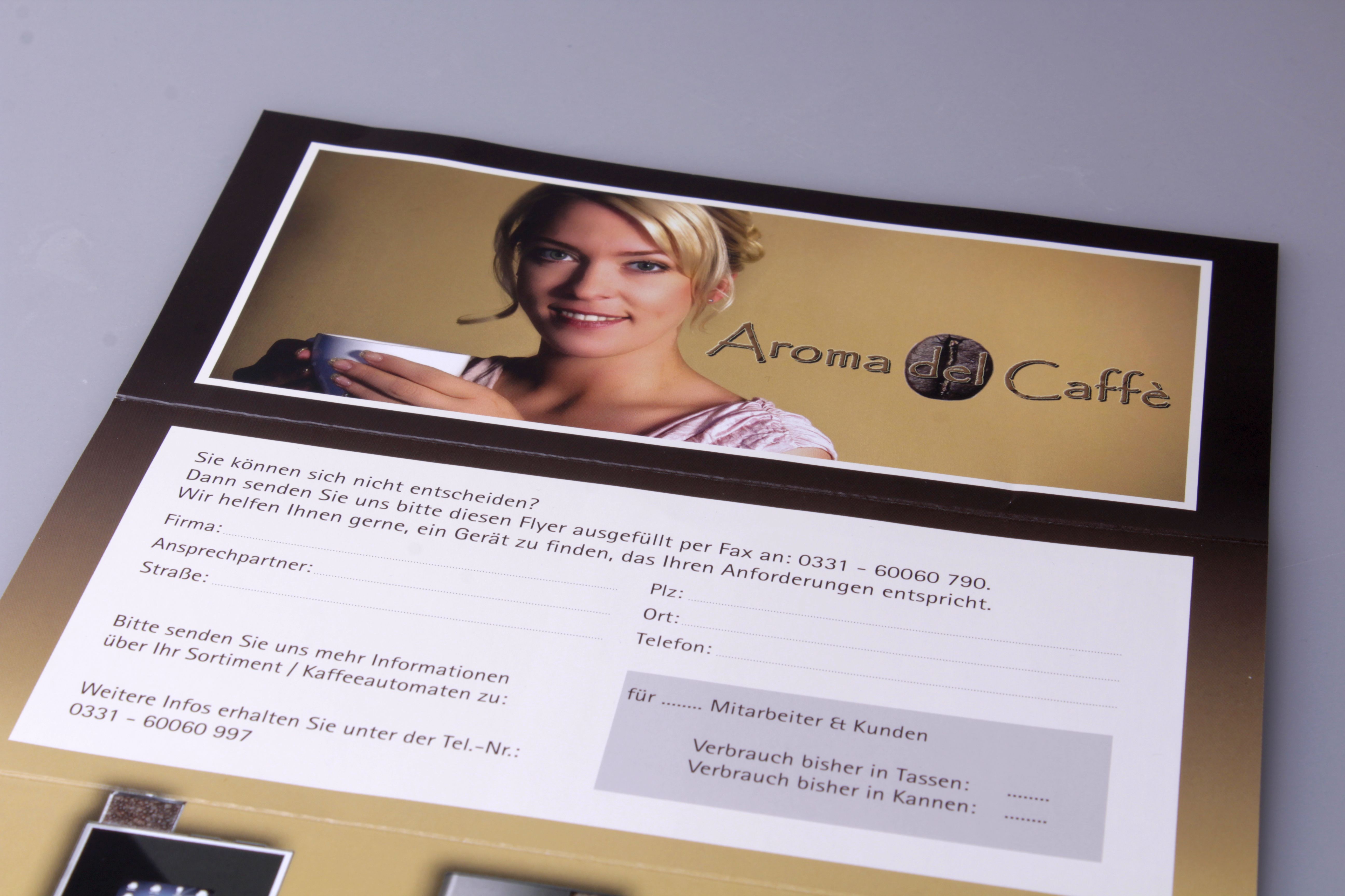 Die Firma Aroma del Caffè beauftragte uns vor einiger Zeit mit der Überarbeitung ihres Flyers, in welchem sich der Kunde einen ersten EIndruck vom Unternehmen verschaffen, sowie einen Beratungstermin vereinbaren kann. Hierbei spielte natürlich die Beachtung des Coperate Identity bei gleichzeitiger Modernisierung eine große Rolle. Der angesprochene Kunde sollte sich von dem Flyer angezogen fühlen und ihn ebenso mit Kaffee verbinden.