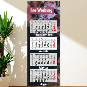 3- und 4-Monatskalender mit bedruckbarer Kopfklappe inkl. individuellem Layout* und Metallöse zum Aufhängen: 50 Stk. = 4,90 €/Stk. 100 Stk. = 3,90 €/Stk. 200 Stk. = 3,50 €/Stk. 300 Stk. = 2,90 €/Stk. 400 Stk. = 2,50 €/Stk. Weitere Kalendermodelle wie mit zusätzlichen bedruckbaren Leisten zwischen den Monaten gern auf Anfrage. |