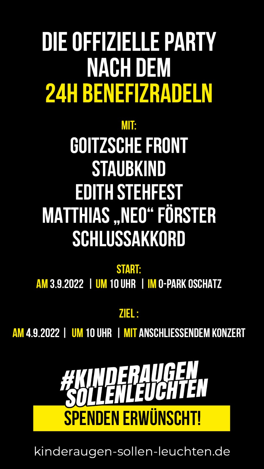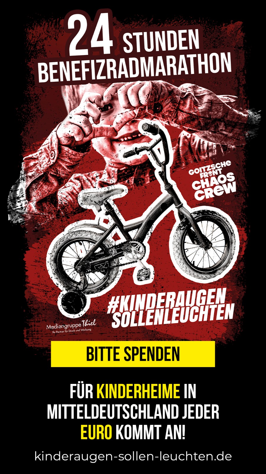 Kinderaugen sollen leuchten – 24h Strampeln für Kinderheime „24h Radeln – Kinderaugen sollen leuchten“ – unter diesem Motto treten am 11.09.2022 Radfahrer*innen auf einer Strecke von rund 500 km kräftig in die Pedale, um in 24 Stunden möglichst viele Spendengelder für jeden geleisteten Kilometer einzufahren. Die Spenden gehen zu 100 % an 4 Kinderheime in Mitteldeutschland und im Hochwassergebiet. An den Start geht eine bunte Mischung aus Einzelfahrern oder Radteams, die aus Männern und Frauen, Promis, Hobby-Radfahrern oder Sportskanonen, jung oder älter bestehen. Die große Gemeinsamkeit bei allen ist die unermüdliche Motivation für leuchtende Kinderaugen richtig was zu bewegen und die Waden zum Glühen zu bringen. Die Aktion startet am 3.9.22 um 10 Uhr in Oschatz und endet, 24 Stunden später, wieder im O-Park in Oschatz. Die Strecke geht quer durch Mitteldeutschland mit Zwischenstop auf halber Strecke in Bitterfeld. Zur Zieleinfaht am 04.9. im O-Park werden die Radfahrer durch ein Bühnenprogramm mit Moderatoren empfangen und gefeiert. Zwei Bandmitglieder von Goitzsche Front und weitere Musiker-Kollegen strampeln nicht nur selbst mit, sondern werden noch ein abschließendes Benefiz Konzert mit freiem Eintritt geben. Alle Infos, Programm und Live-Berichte zum 3.9.22 findet Ihr auf kinderaugen-sollen-leuchten.de und über die Kanäle Instagram und Facebook.