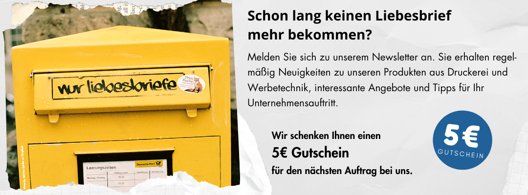 Wir verwenden Ihre Angaben zunächst, um Ihnen eine E-Mail zur Bestätigung Ihrer Anmeldung zuzusenden. Erst nach Bestätigung Ihrer Anmeldung verwenden wir Ihre E-Mail-Adresse, um Ihnen regelmäßig und kostenlos Neuigkeiten rund um das Thema Druck und Werbetechnik sowie interessante Angebote zuzusenden.